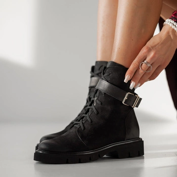 Czarne traperowe botki z ozdobnymi sznurówkami