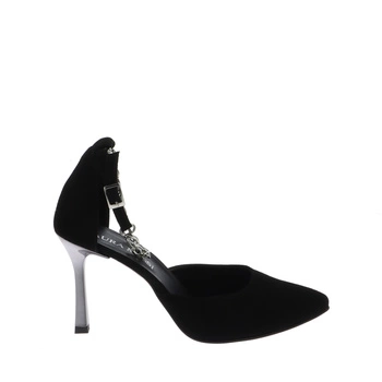 Czarne zamszowe sandały na szpilce z łańcuszkiem