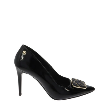 Czarne lakierowane szpilki z elegancką ozdobą